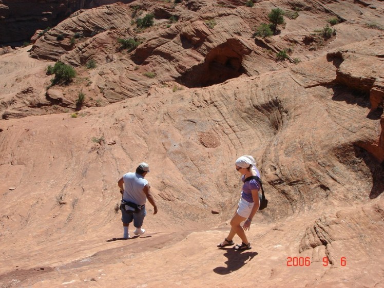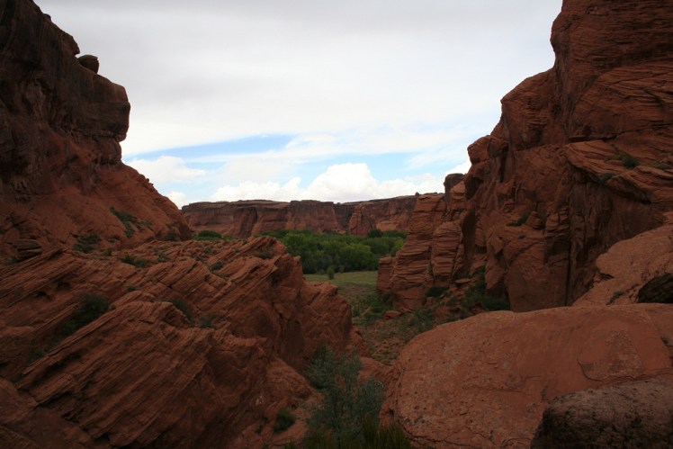 En dag åkte vi till Canyon de Chelly, fortfarande inom navajoområdet. Vi tänkte först ta en av alla turer som går att haka på i området men när vi kom dit visade det sig att det går att hyra en privat guide, alltid navajoindian, närsomhelst och för endast 15 dollar i timmen. – Taget, sade vi och bokade upp en 3-4 timmars hike direkt. Vår guide för hiken hette Raymond Yellowbird. Han var en aning reserverad till en början men visade sig vare en bra guide och ett trevligt sällskap under turen. Turen gick ner i dalen vid Ledge Ruin Overlook och gick längs dalen för att sedan komma upp vid Tunnel Overlook igen. Trevlig tur i trevligt klimat och vacker miljö. Raymond visade oss pueblohusen i bergen, fyrkantiga eller runda hus där indianernas förfäder bodde för flera hundra år sedan. Efter puebloindianerna innebodde navajoindianerna dalen och från dem kan man i de branta bergen se utstakade stigar som nötts ut i berget. Fascineras över att de verkligen tog sig fram på dessa branta berg och än mer fascinerad över att indianerna gjort målningar på helt vertikala väggar. Hur stod de när de gjorde dem?