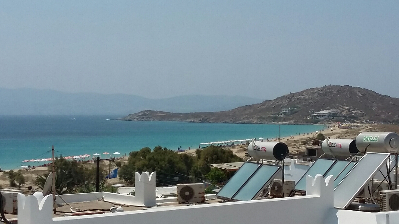Naxos är största ön i Kykladerna och här kändes det mer likt vanliga turistorter och ön huserar många skandinaver. Vi hade valt ett boende som heter Colosseo Star och som låg strax söder om hamnen och Naxos stad, vid stranden Agios Prokopios. Familjevänligt och nära stranden och ägarna var tillmötesgående och vänliga. Trädgården är full med små keramikfigurer som tittar fram lite här och var och det finns pool och klätterställning, gungor mm. Vi bodde i en tvårumslägenhet med fyra sängar och balkong, rymligt och bra och gjorde att vi här valde att ha stortvätt av kläder.