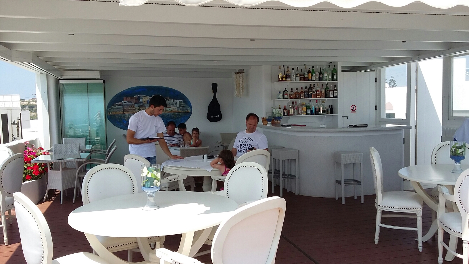 Redan första dagen träffade vi en norsk familj med två döttrar i samma ålder som våra på hotellet. Barnen lekte och hade jättekul tillsammans så det blev även en hel del häng runt poolen på hotellet för att de skulle träffas. Sista kvällen på Naxos åkte vi tillsammans in till Naxos stad där vi åt mat på en fiskrestaurang vid hamnen som heter Meze och var ett tips från ägaren på hotellet och som var snäll och skjutsade oss in. Naxos stad gillade jag mycket speciellt de mysiga gränderna, tavernorna och det var festlig stämning, kanske för att det var lördagskväll.