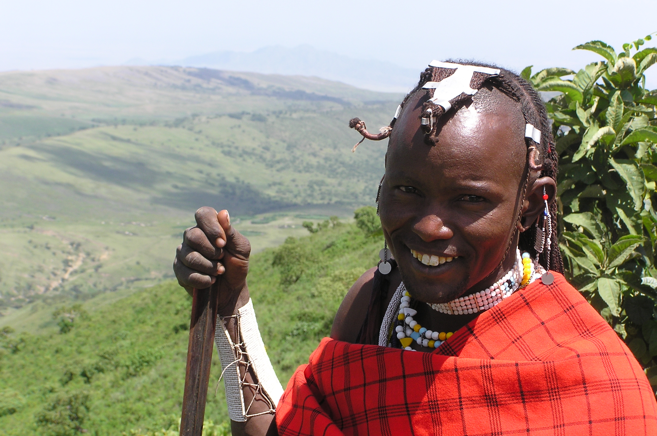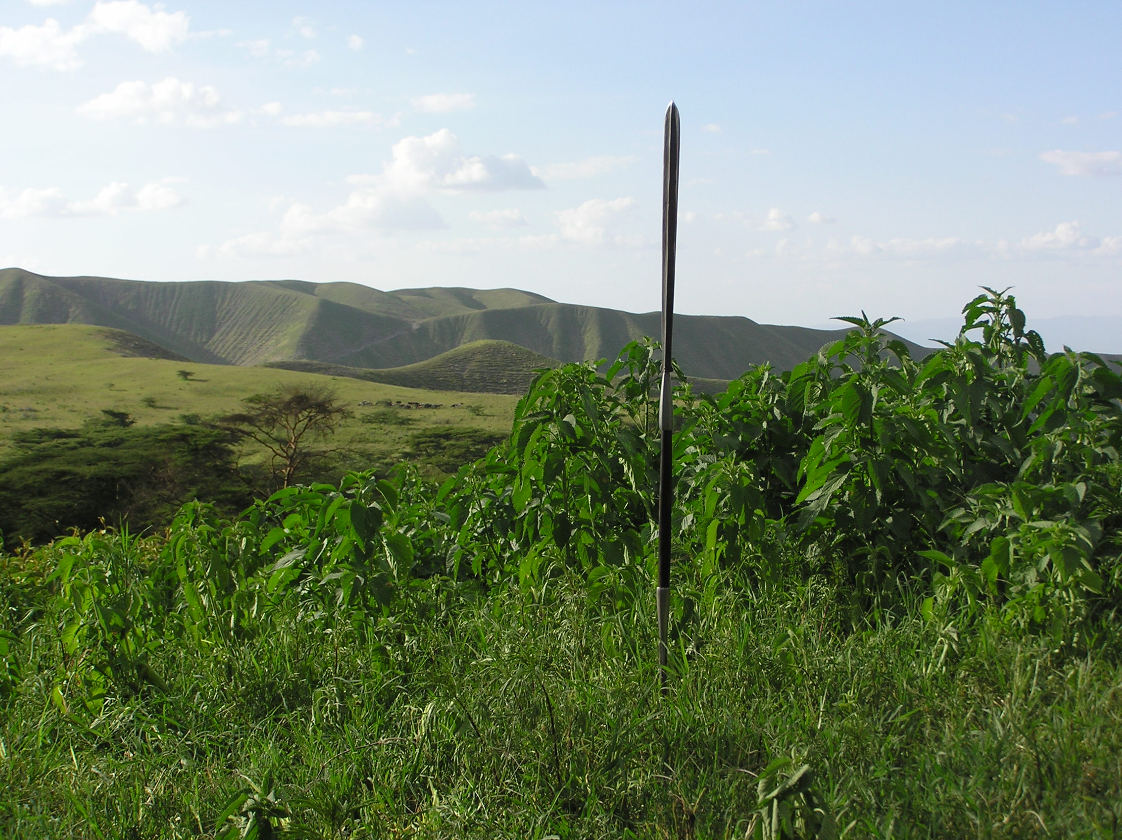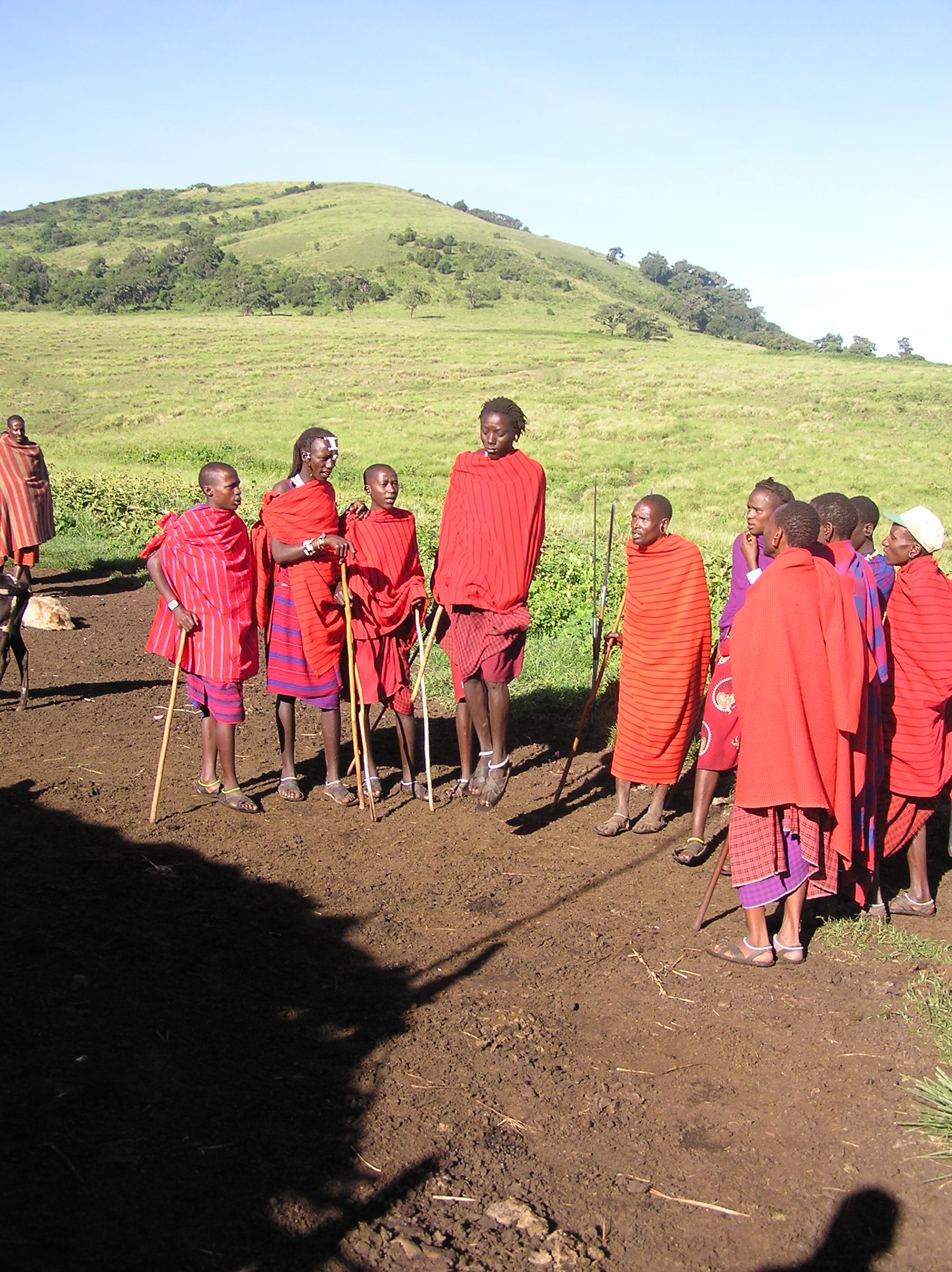 Första dagen gick vi 16 km genom massajland, flera byar i ett grönt och kulligt landskap. Det var en ganska bra stigning uppåt när vi gick upp för Embakai-kraterns sluttning. Embakai-kratern är liksom Ngorongoro en caldera, dvs ett kollapsat berg. Från kraterns kant kunde vi se vattnet med bl a flamingos nere i kratern. På vägen lärde Philip, Michael och Sadida oss olika växter och deras nyttoegenskaper. Det var en som de var väldigt måna om att vi inte vidrörde, en hög nässelliknande växt som tydligen gjorde riktigt ont att bränna sig på. Pelle fick testa kasta Sadidas spjut vilket Sadida tyckte var mycket roligt eftersom Pelle inte lyckades sätta det i marken…