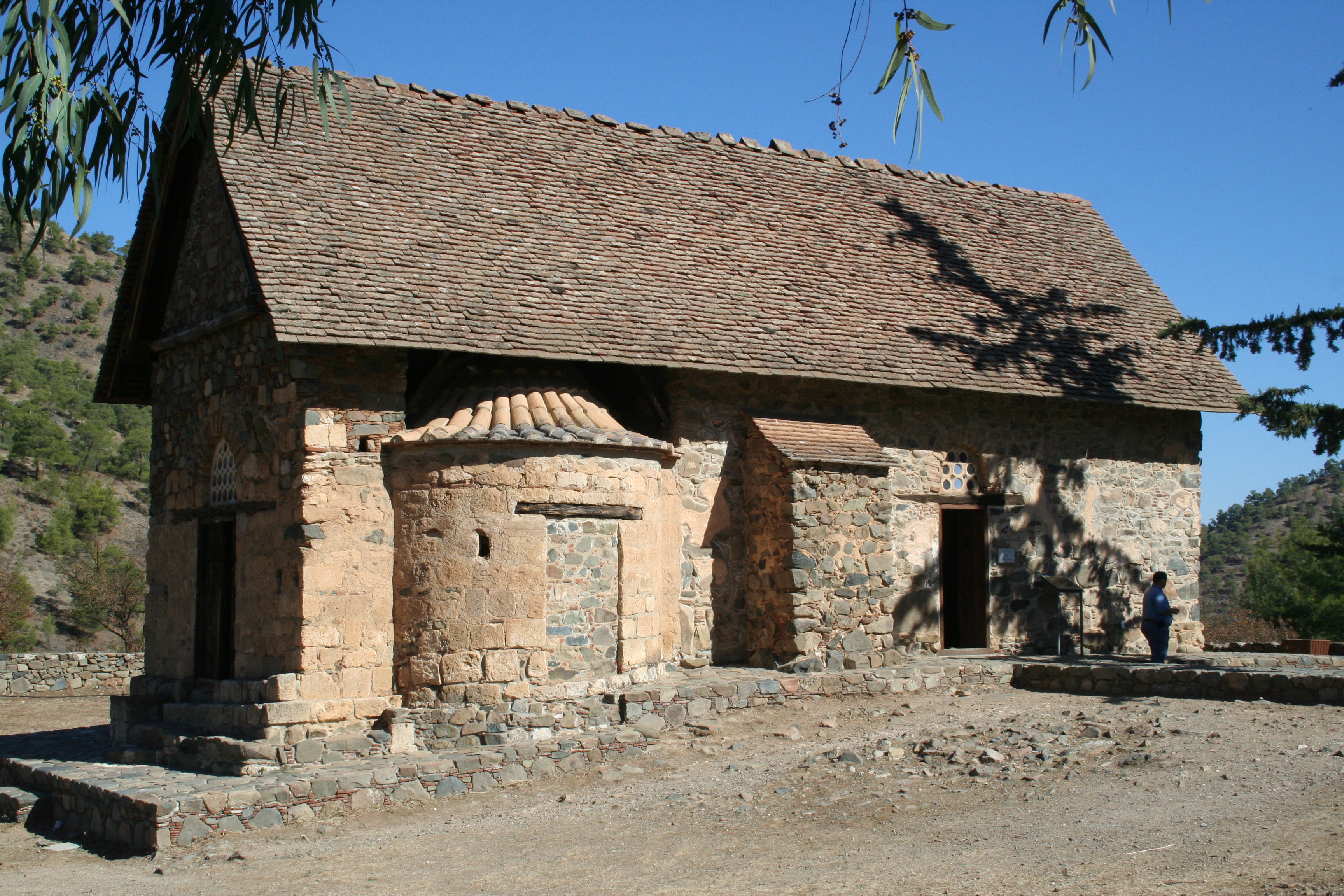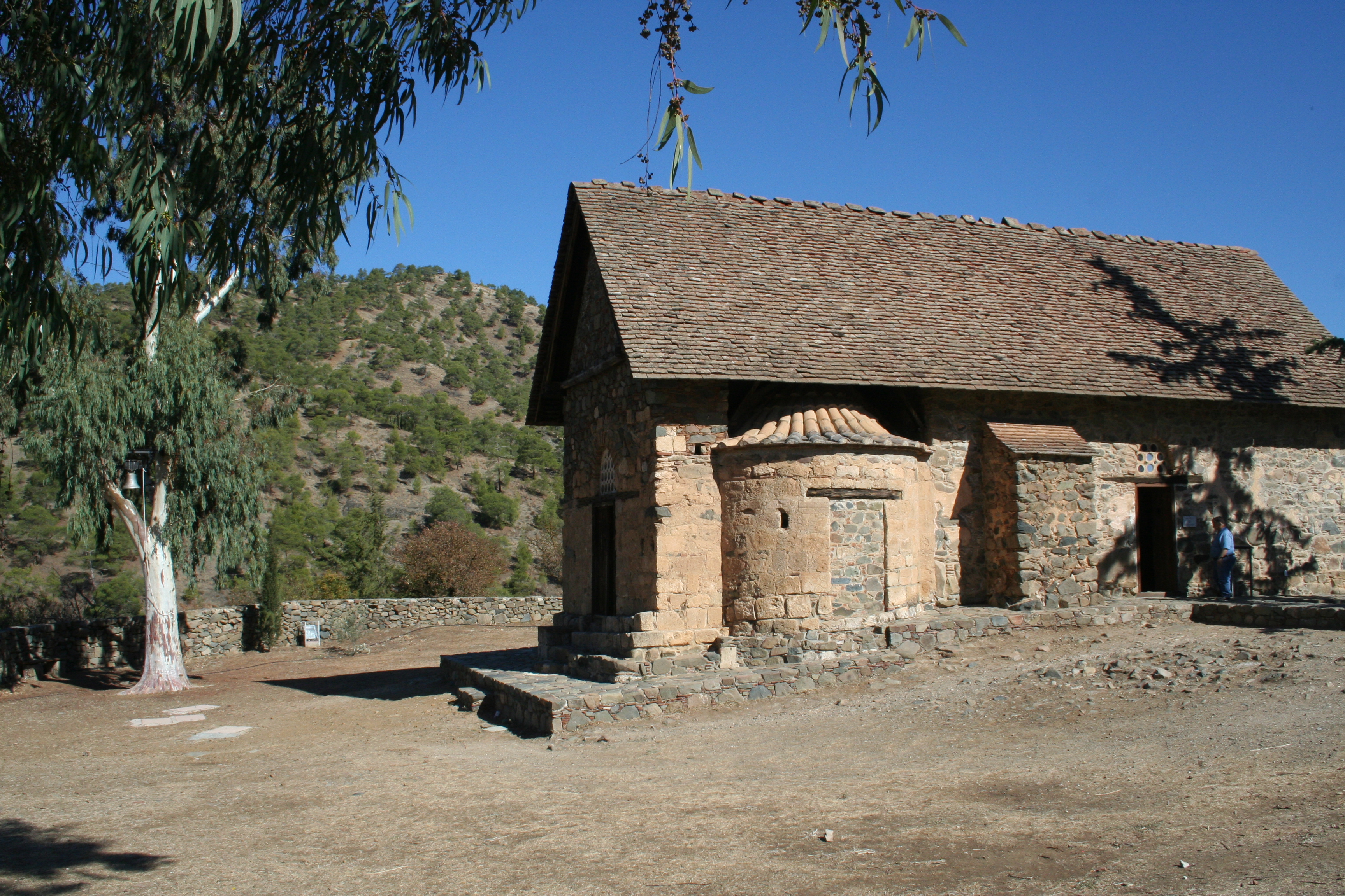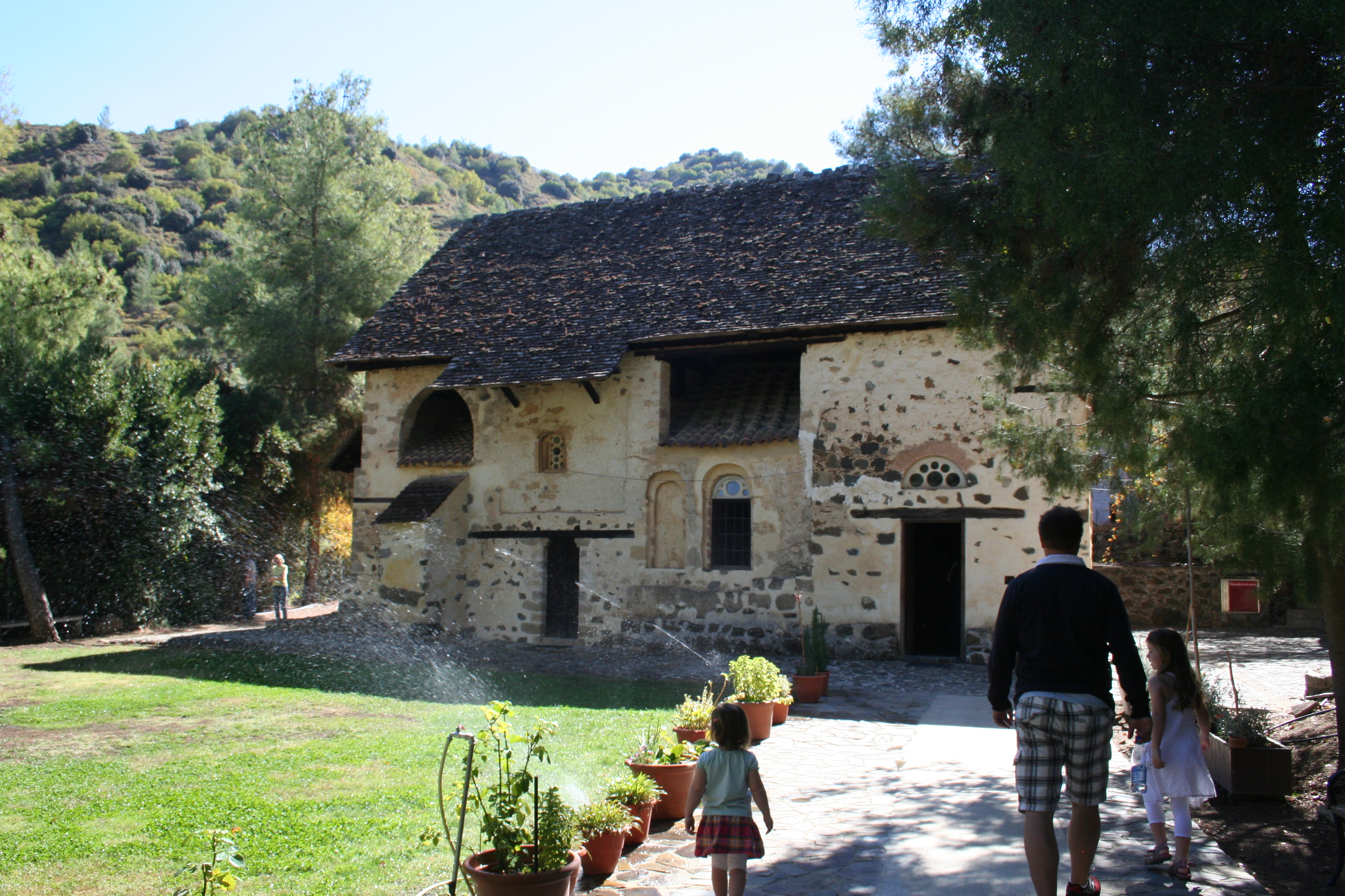 Vi hade berättat att vi var intresserade av Trodoosbergen och bland annat de bysantiska kyrkor med originalmålningar från medeltiden som finns där. Så Michalis tog oss först till den lilla mysiga kyrkan Panagia Asinou. Kyrkan är upptagen på UNESCOs världsarvslista och har mycket fina originalmålningar från 1100-1600-talet. Fotografering inne i kyrkan är förbjuden, så bilderna är på exteriören . Bredvid kyrkan står ett stort eukalyptus-träd och här finns också mandelträd, vilket var kul att visa barnen.