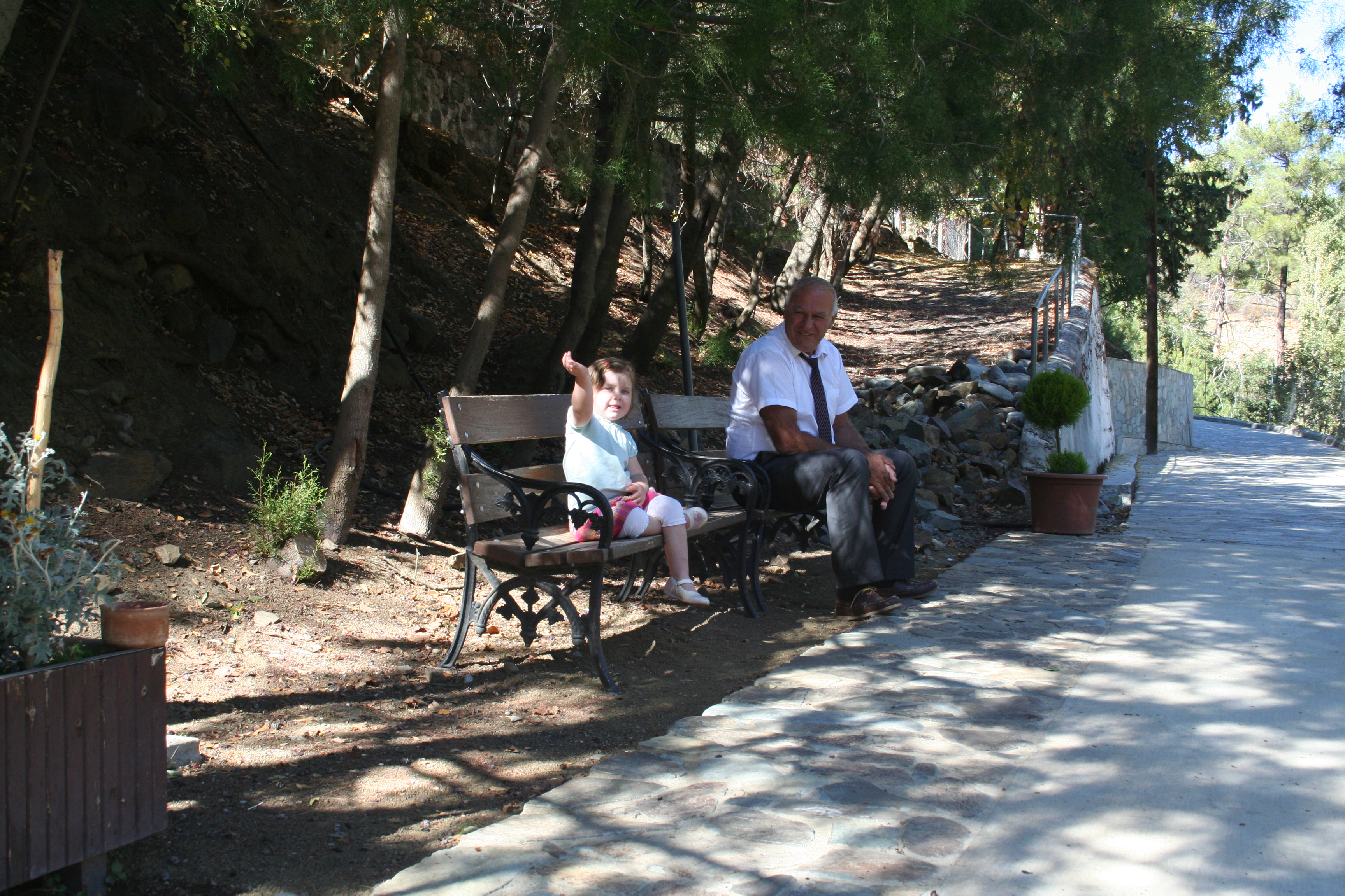 Meja och Michalis på bänk utanför Agios Nikolaus tis Stegis