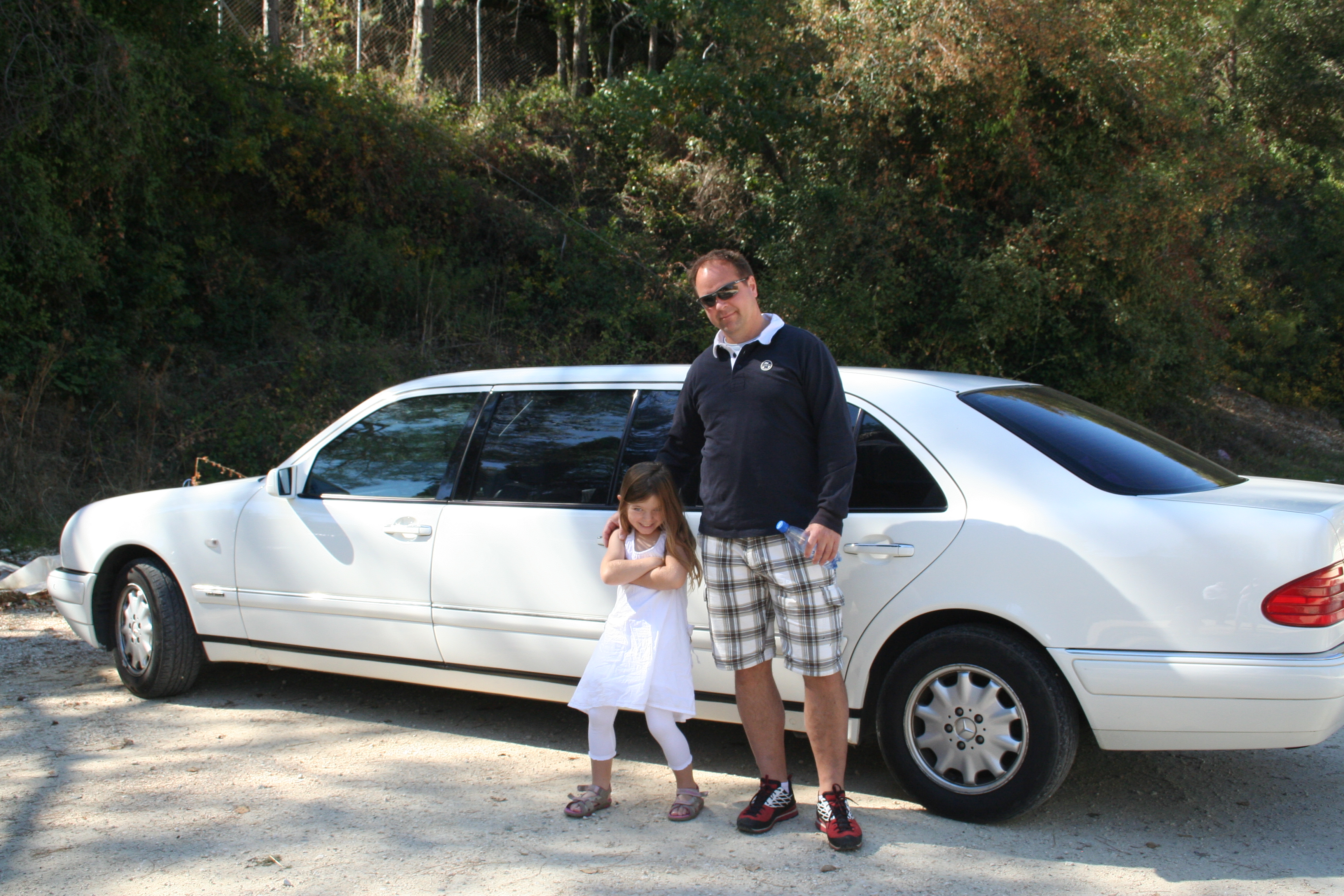 Vi var lite sugna på Vings utflykter bland annat den som skulle gå till norra turkiska delen samt den som heter Cyperns pärlor och innefattade Troodosbergen och ett vintillverkningsbesök. Nu är våra barn ganska härdade när det gäller bilresor och att få hänga med på både det ena och det andra men det kändes ändå ganska risky att ha en 3- och en 6-åring som ska sitta helt tysta i bussen för att guiden ska få sin stämma hörd, plus att rundturen upp i bergen kan bli lite slingrig och jag vill ju inte behöva stanna bussen för att jag och mina barn behöver frisk luft med jämna mellanrum. Nä, efter mycket fundering så frågade jag i receptionen om de inte visst någon guide som körde privata turer. Då dök Michalis namn upp. Han är gift med inköpsansvarig på hotellet. Han ville ha 300 euro för en heldag och visst tyckte vi att det var dyrt men slog i alla fall till på det. Jag funderade lite kvällen innan på hur han skulle lösa det här med bilbarnstolar och utrymme i bilen eftersom vi ju var två barn och två vuxna. Men han har väl en van-liknande bil eller ngt tänkte jag, eller så får vi väl klämma ihop oss helt enkelt. Morgonen därpå vid 9 när vi möter upp Michalis i receptionen och han visar oss ut till bilen får vi svaret. Där står en vit Mercedes-limo! Flott ska det va, sa vi och hoppade in! 🙂
